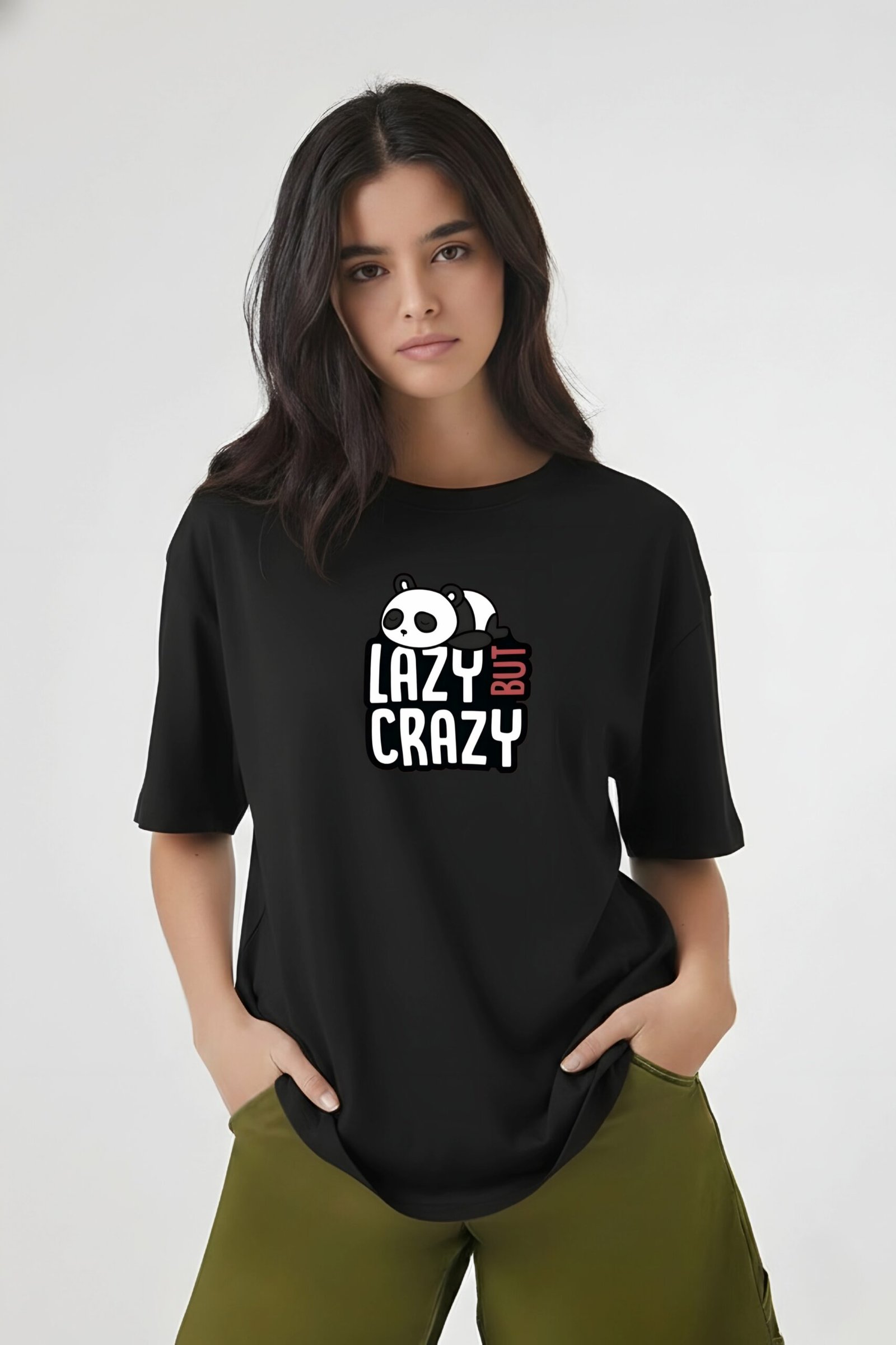 Channel your inner spirit animal with the “Lazy But Crazy” Panda T-shirt. This black oversized t-shirt features a playful illustration of a sleeping panda perched atop bold, stylized typography. It’s the perfect blend of cute and edgy for those days when you’re feeling low-energy but high-personality.