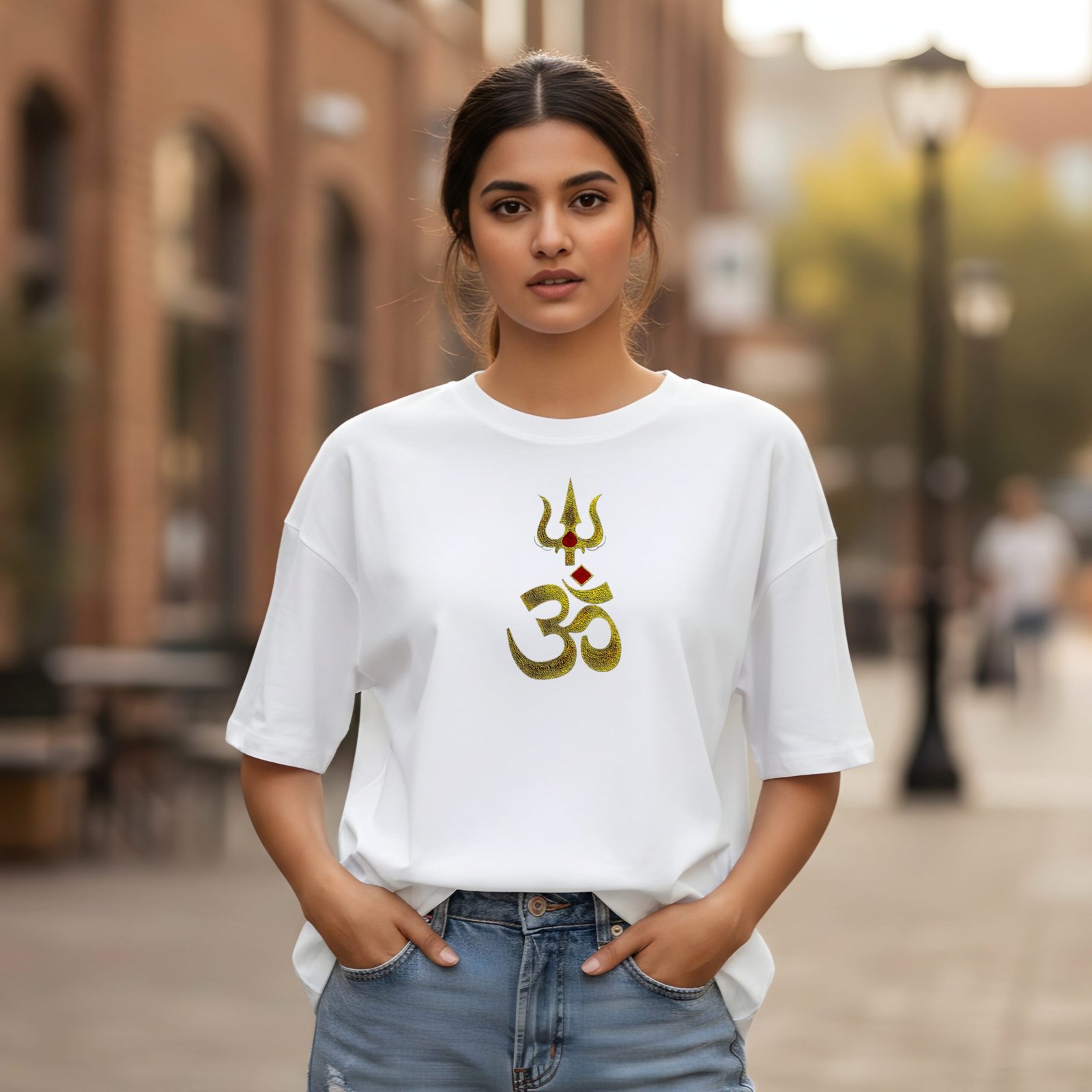 Embrace spiritual energy and timeless symbolism with our Mystic Trishula & Om T-shirt. This white t-shirt features a striking golden-yellow graphic combining the sacred Om symbol with the powerful Trishula (trident). The design is rendered with a unique, textured “etched” effect and accented with deep red highlights, making it a powerful statement piece for your casual collection.
